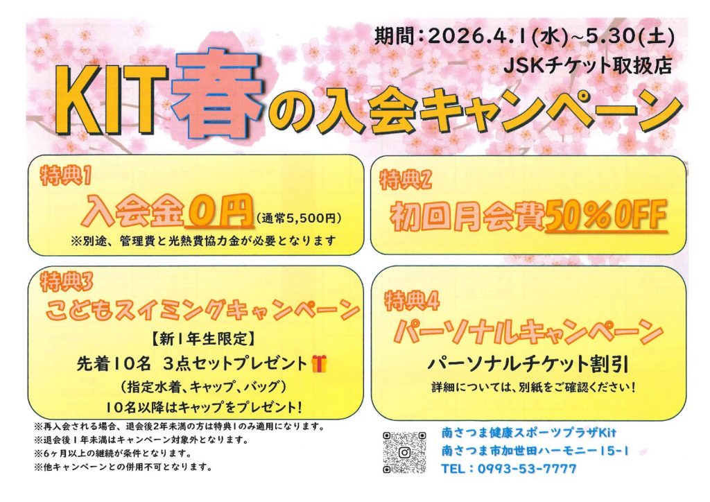 キットでは4月1日より春の入会キャンペーンがスタートします。